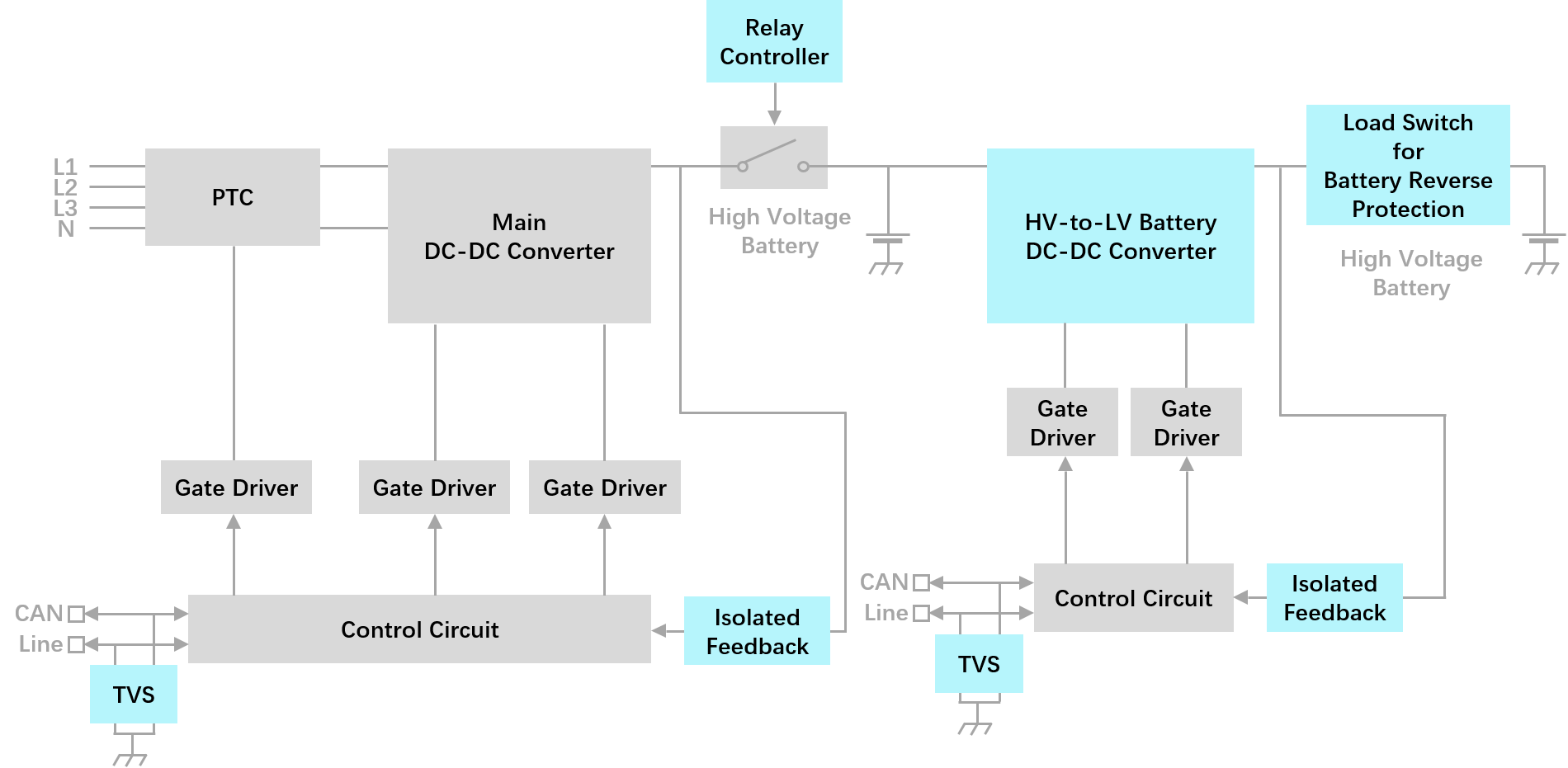 電網(wǎng)中的交流電通過交流充電樁直接給車載充電器 (OBC) 供電,OBC 把 AC 轉(zhuǎn)換成 DC,然后通過配電箱為車內(nèi)的動(dòng)力電池充電。直流充電樁則包含許多 AC-DC 電源模塊。從目前充電樁市場(chǎng)的狀況來看,有 3 大趨勢(shì):寬范圍的恒定功率、寬范圍的輸出電壓、更高功率的模塊。 兩個(gè)主要功率級(jí)。首先,功率因素校正 (PFC) 級(jí),保持輸入電流和電壓之間的相位關(guān)系,最大限度地減少線路/電網(wǎng)電流的總諧波失真 (THD) 。這有助于減少任何浪費(fèi)的無(wú)功功率,提高整體能效。 第二功率級(jí)是 DC-DC 轉(zhuǎn)換器,它從 PFC 級(jí)獲得 DC 輸出,并將其轉(zhuǎn)換為電池充電所需的電平。轉(zhuǎn)換器的輸出電壓和電流基于電池的整體健康狀態(tài)和充電狀態(tài)隨時(shí)間變化。 不論是功率因數(shù)校正(PFC)、原邊側(cè) DC-DC、或二次整流,捷捷微電都具有相應(yīng)的解決方案,汽車系列產(chǎn)品涵蓋二極管、MOSFET、TVS 等各類產(chǎn)品。比如:整流+LLC 構(gòu)成了充電樁的基本電路,可采用 FRED(快恢復(fù)二極管)方案;CAN 通訊口的 ESD 保護(hù)。