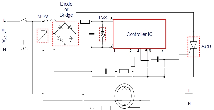 漏電保護(hù)器,簡稱漏電開關(guān),又叫漏電斷路器,主要是用來在設(shè)備發(fā)生漏電故障時(shí)以及對(duì)有致命危險(xiǎn)的人身觸電保護(hù),具有過載和短路保護(hù)功能,可用來保護(hù)線路或負(fù)載的過載和短路,亦可在正常情況下作為線路的不頻繁轉(zhuǎn)換啟動(dòng)之用。 目前市場上使用的漏電保護(hù)裝置種類繁多,但大體的原理都相差不大。漏電保護(hù)器主要是由三部分組成:檢測元件、中間放大環(huán)節(jié)、操作執(zhí)行機(jī)構(gòu) 1. 檢測元件:由電流互感器組成,檢測漏電電流并發(fā)出信號(hào) 2. 放大環(huán)節(jié):將微弱的漏電信號(hào)放大,按裝置不同可采用機(jī)械式或電子式 3. 執(zhí)行機(jī)構(gòu):收到信號(hào)可控硅由斷開狀態(tài)變?yōu)閷?dǎo)通狀態(tài),主線圈通電后,主開關(guān)由閉合狀態(tài)轉(zhuǎn)換為斷開狀態(tài),從而切斷電源 應(yīng)用于漏電保護(hù)器領(lǐng)域,捷捷微電 能提供比較齊全的元件解決方案。比如:AC 輸入端防浪涌的壓敏電阻(MOV)、對(duì)交流進(jìn)行整流的高壓整流二極管 (Diode) 或者是整流橋(Bridge)、對(duì)電源端進(jìn)行過壓防護(hù)的瞬態(tài)抑制二極管(TVS)、整個(gè)電路的控制核心集成電路(IC)、電路動(dòng)作執(zhí)行機(jī)構(gòu)(SCR)等。