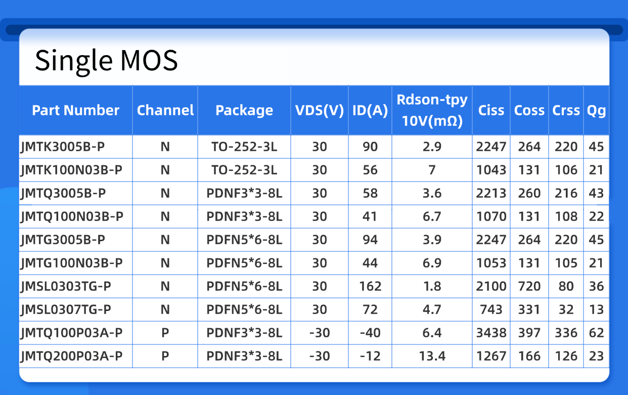 ? JMSL0303TG-P/JMSL0307TG-P:采用SGT工藝,優(yōu)化柵極電荷(Qg=13nC),開(kāi)關(guān)頻率可達(dá)2MHz,適合高頻應(yīng)用