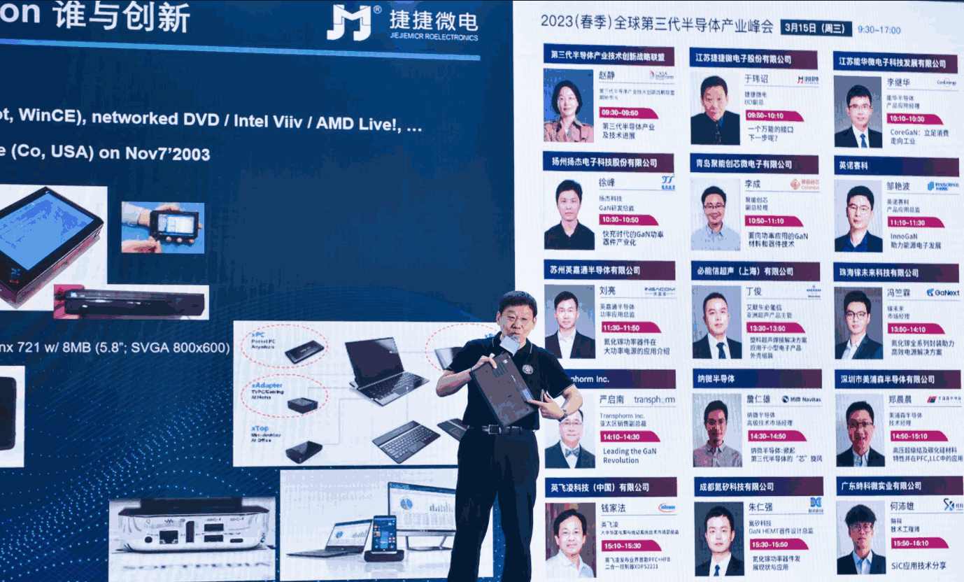 展會期間,捷捷微電業(yè)務拓展副總于瑋詔先生受邀出席全球第三代半導體產(chǎn)業(yè)峰會,以《一個萬能的接口,下一步呢?》為主題發(fā)表演講。介紹了捷捷微電近來來在快充領域的布局,如何為消費類電子提供更便攜、更安全的用電。并進一步指出移動 3C 終端的充電器越來越短小,有限的內殼空間使工作溫度升高,造成充電器內部所用器件的穩(wěn)定性和效能方面的要求極為嚴苛。捷捷微電自主研發(fā)的JSFET 及 JHFET 能輕松解決了電路設計工程師所面臨,合理成本和高電源轉換效率這兩個沖突的難題。
